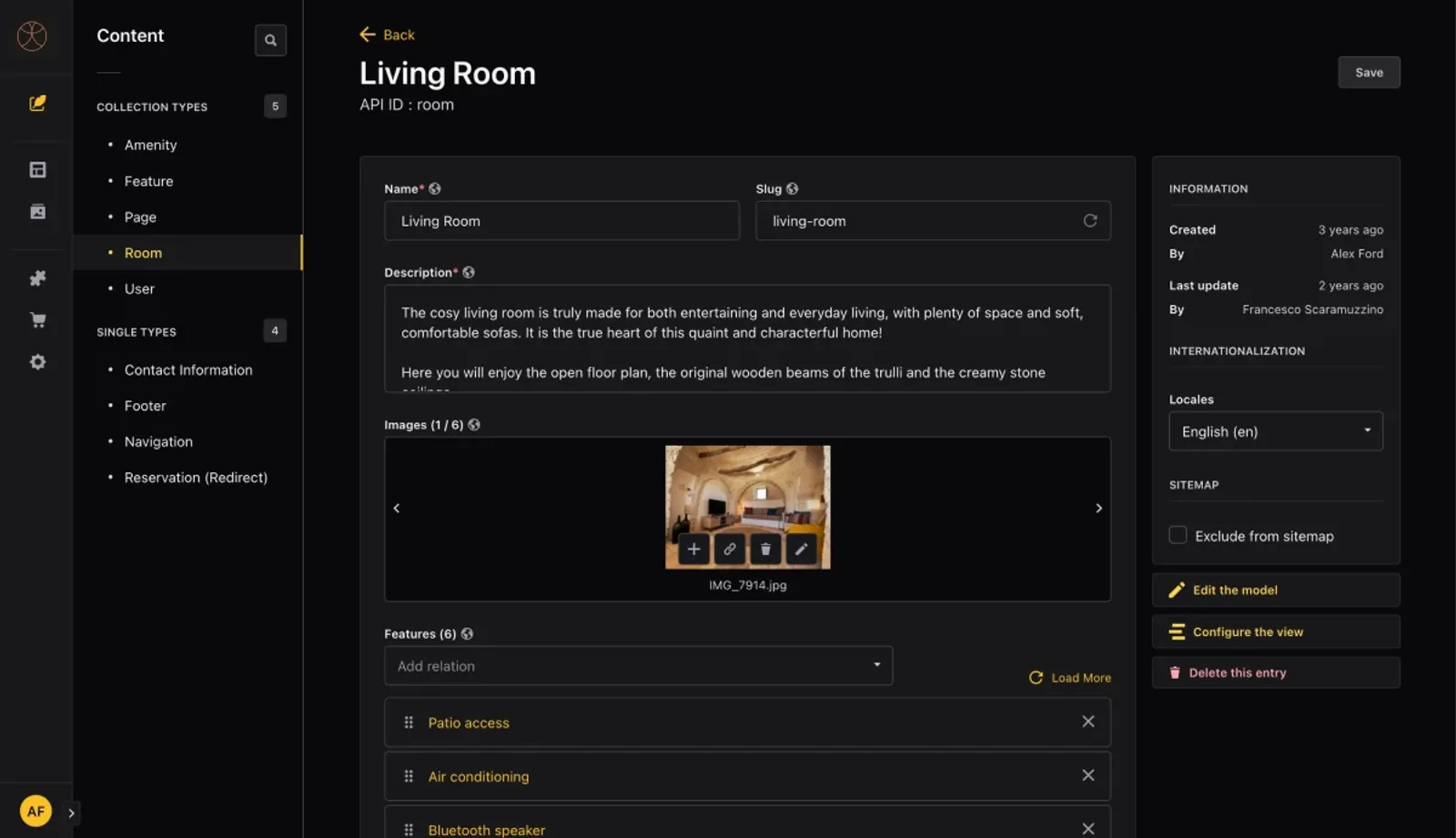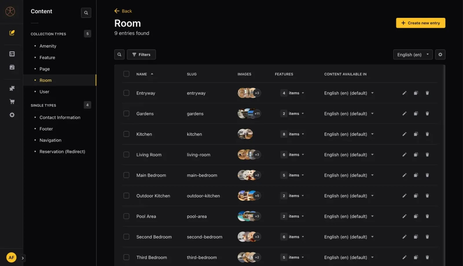 I settled on Strapi as a CMS solution; as an open-source headless CMS, it gave me the ability to define the custom content models required - not just for pages, but also rooms & amenities - while giving the owners the ability to make structured edits through a clean, easy-to-understand admin interface & without the need to touch any code.