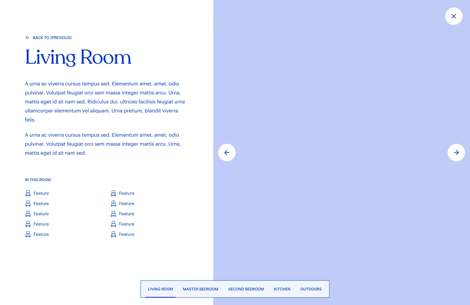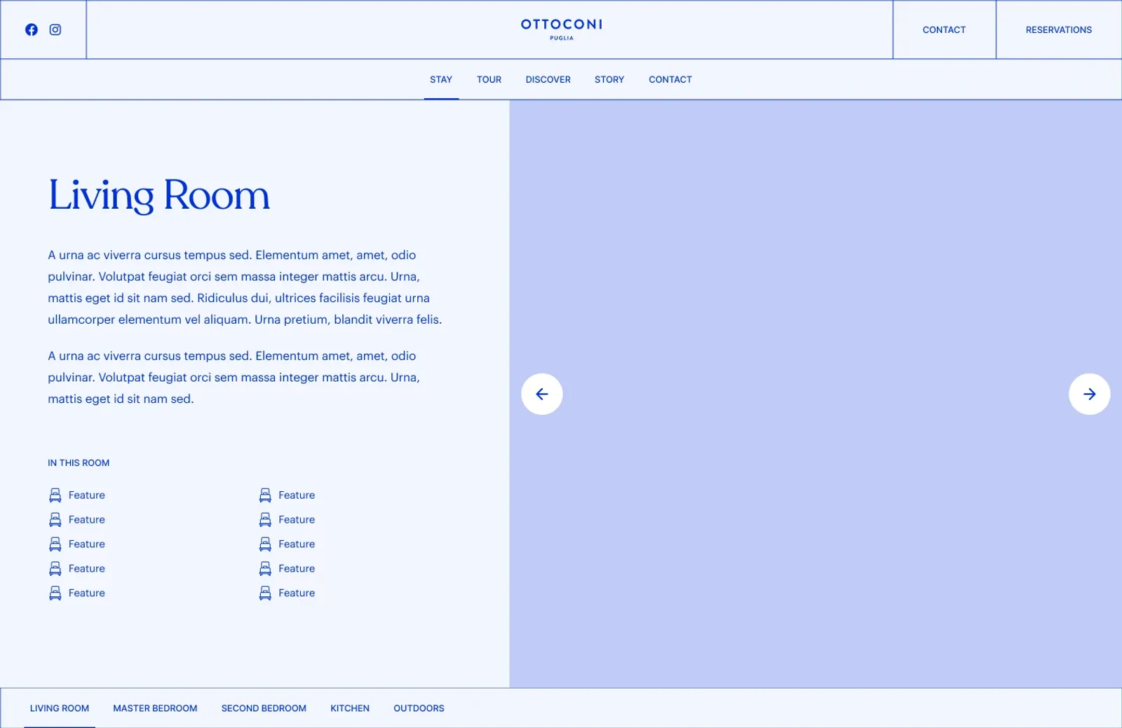 One of the biggest opportunities in creating a bespoke experience was the ability to present the trullo in far greater detail than the operator's standardised property listing page would allow. Rather than attempting to show all of the features & photographs within the confines of a single page, I decided to present the property room-by-room in a virtual 'Tour', each with its own gallery of images and list of features.
